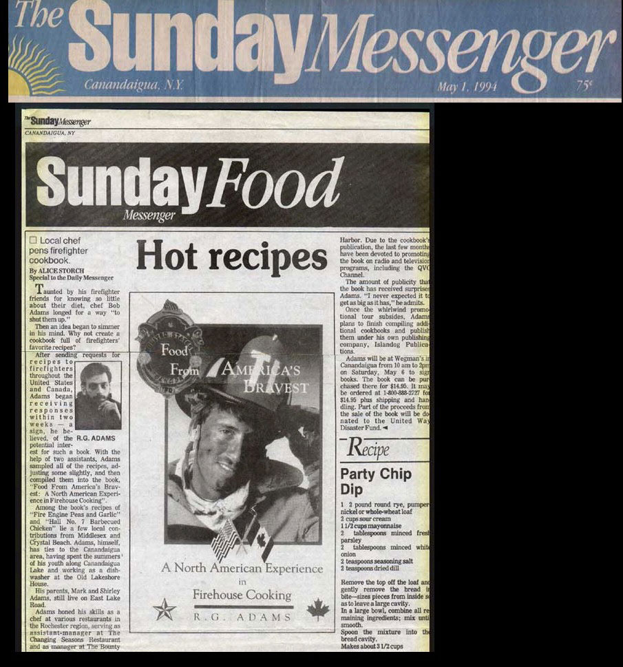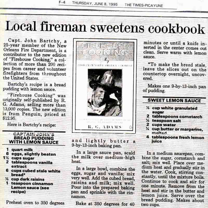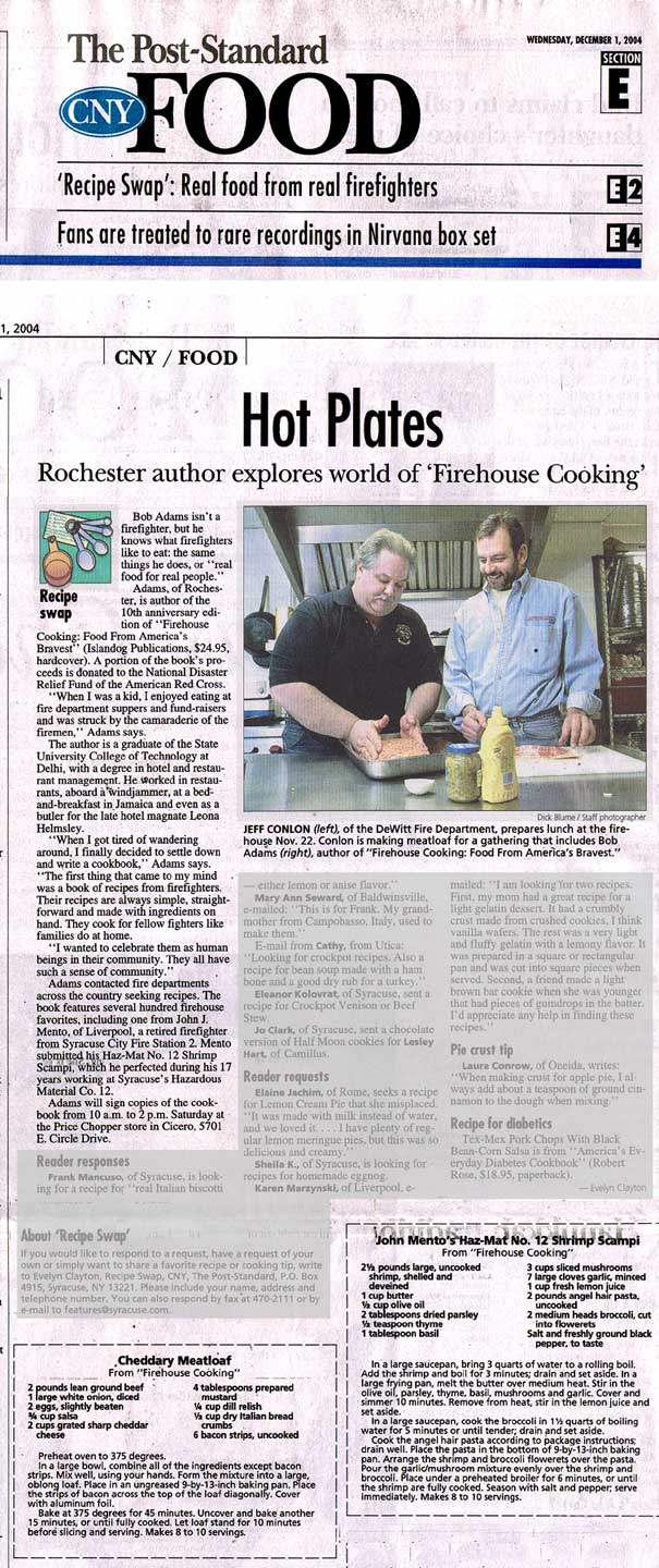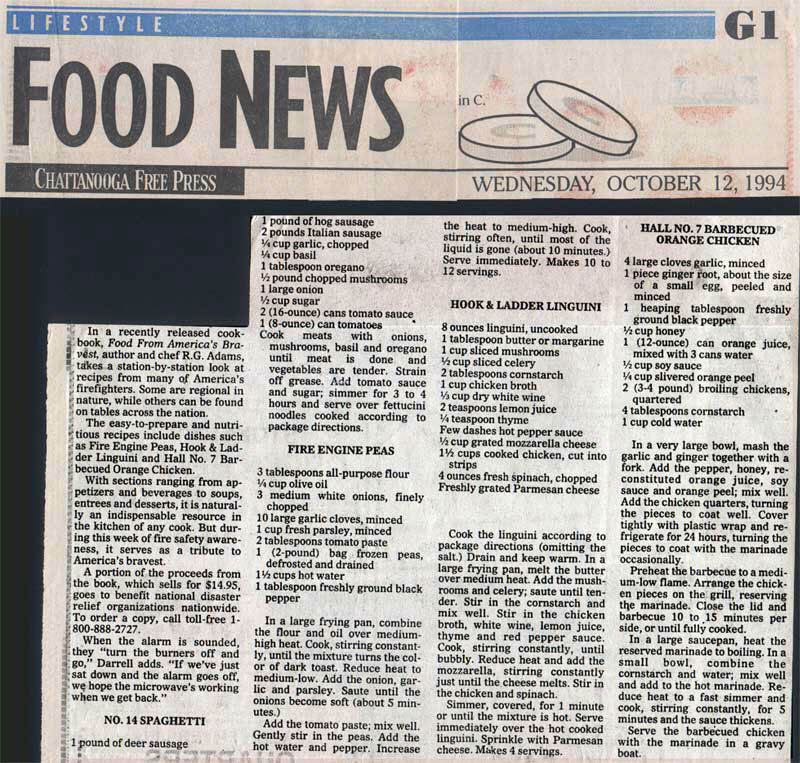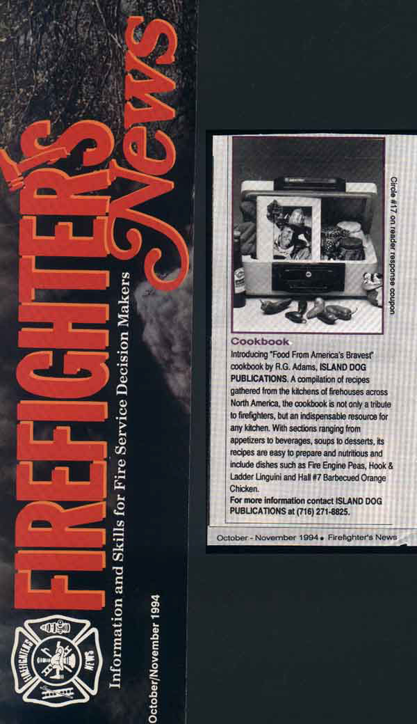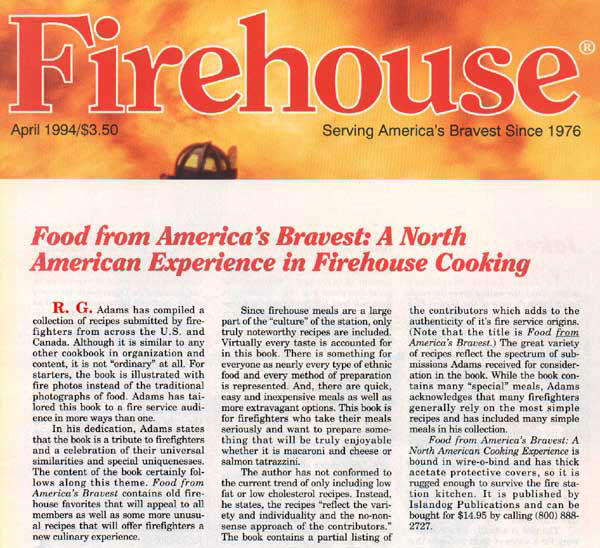 "Firehouse Cooking throws cold water on the notion that the nation’s firefighters simply gobble chili and fried hamburgers between runs….it’s recipes may ring a bell for many other folks, especially those with a run-and-jump lifestyle that leaves little time for preparing meals."